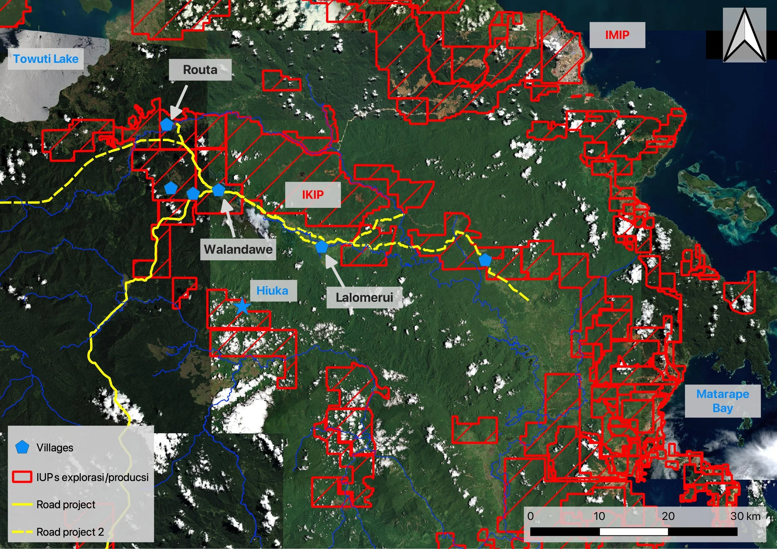 Forêt ultramafique rasée pour planter des poivriers dans l’espoir que cela ralentisse l’implémentation d’une mine de nickel. Carte : en rouge les concessions minières autorisées en phase d’exploration et exploitation (IUPs). L’explosion des mines dans la nord de la province Sulawesi Tenggara s’accompagne de projets d’axes routiers pour desservir les concessions (en jaune). Déjà une large piste existe pour relier le plus grand complexe de transformation de nickel au monde l’Indonesian Morowali Industrial Park (IMIP) au site en construction du nouveau parc de raffinage de nickel : Indonesian Konawe Industrial Park (IKIP). Les rivières (en bleu), le lac Towuti (aire protégée), le lac temporaire Hiuka et la Baie de Matarape sont autant d’écosystèmes particulièrement sensibles qui sont menacés de destruction totale.